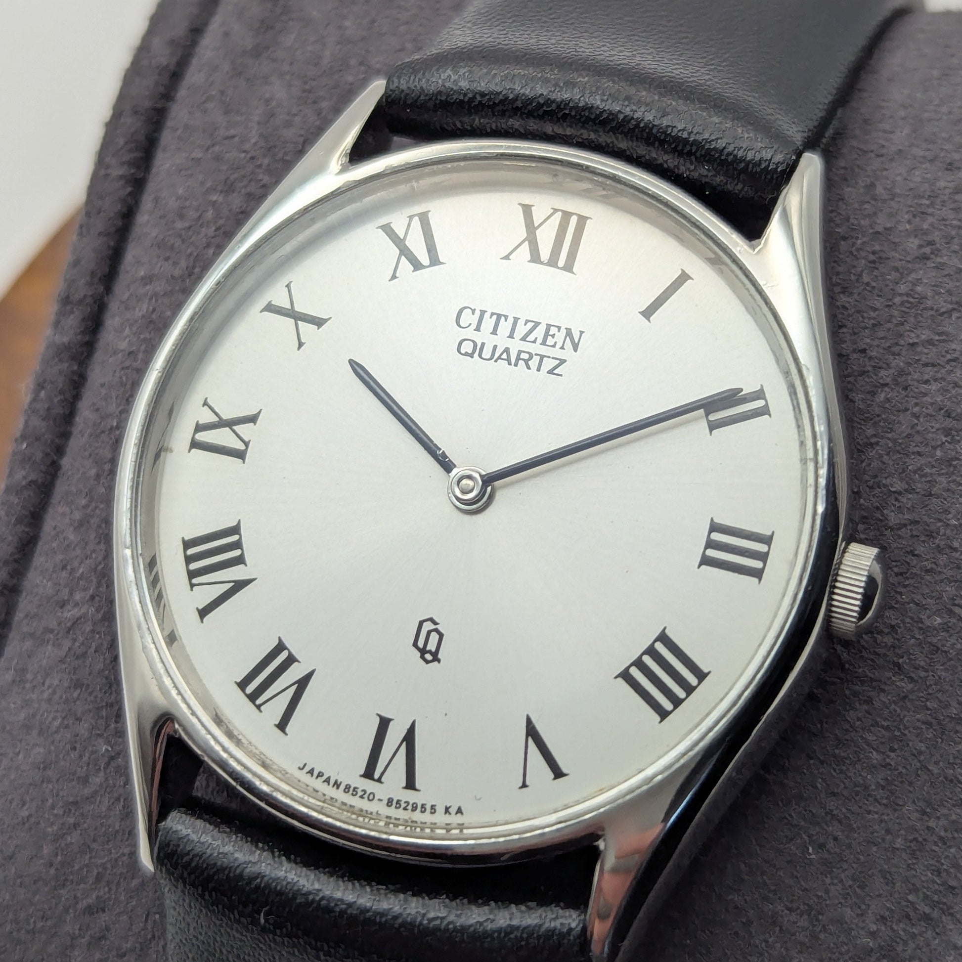 Класичний костюмний годинник з ранньої кварцової епохи Citizen. Модель вирізняється стриманим дизайном зі сріблястим циферблатом і римськими індексами, що надають їй елегантного та позачасового вигляду.